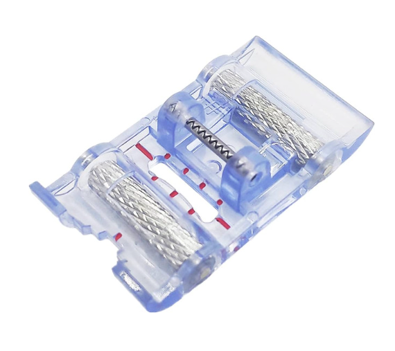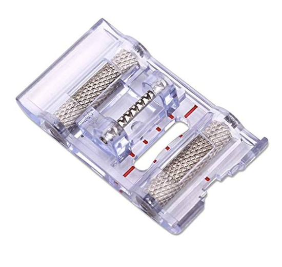 By using the roller foot, sewing work on difficult-to-slide materials can be carried out much more easily and precisely. The metal rollers ensure even and controlled fabric transport, which is particularly important for achieving straight seams and accurate sewing results. This foot is a valuable aid when sewing leather clothing, bags, accessories or other projects that require the use of these materials.